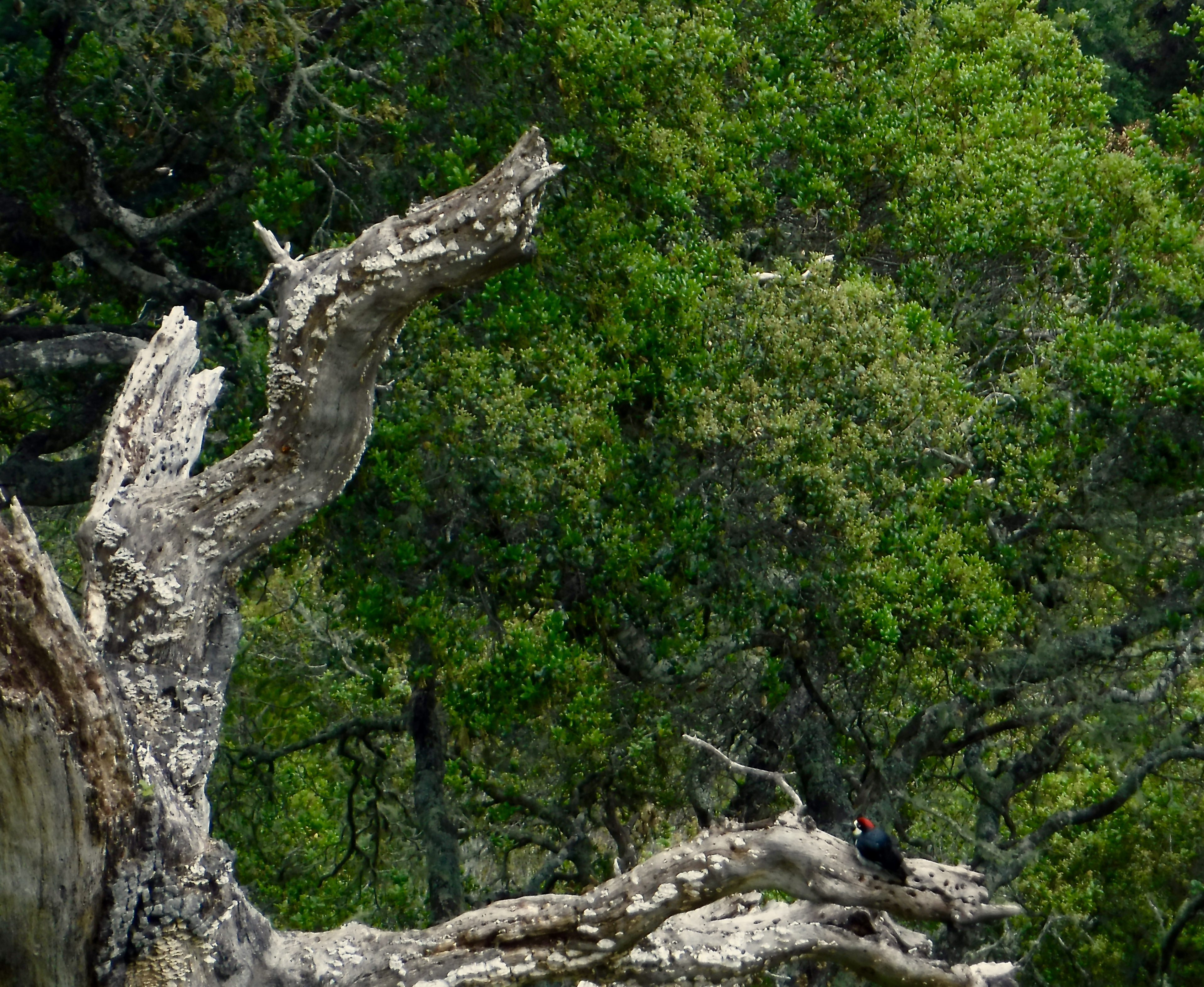 Acorn Woodpeckers (Melanerpes formicivorusare) are very unusual woodpeckers that live in large groups, hoard acorns in granaries, and breed cooperatively. Cooperative breeding is defined as more than two birds taking care of nestlings in the nest. At Nepenthe, a group of acorn woodpeckers gathered acorns by the thousands last fall and wedged them into holes they’ve made in tree trunks, telephone poles, or side of the restaurant. Several were flitting about perhaps inspecting their cache or catching insects, another source of food. These birds will mate in the fall when the acorns are plentiful that is unusual for most birds. I suspect this display was less to impress than to capture a tasty insect or a vintage acorn. It was at Nepenthe afterall…