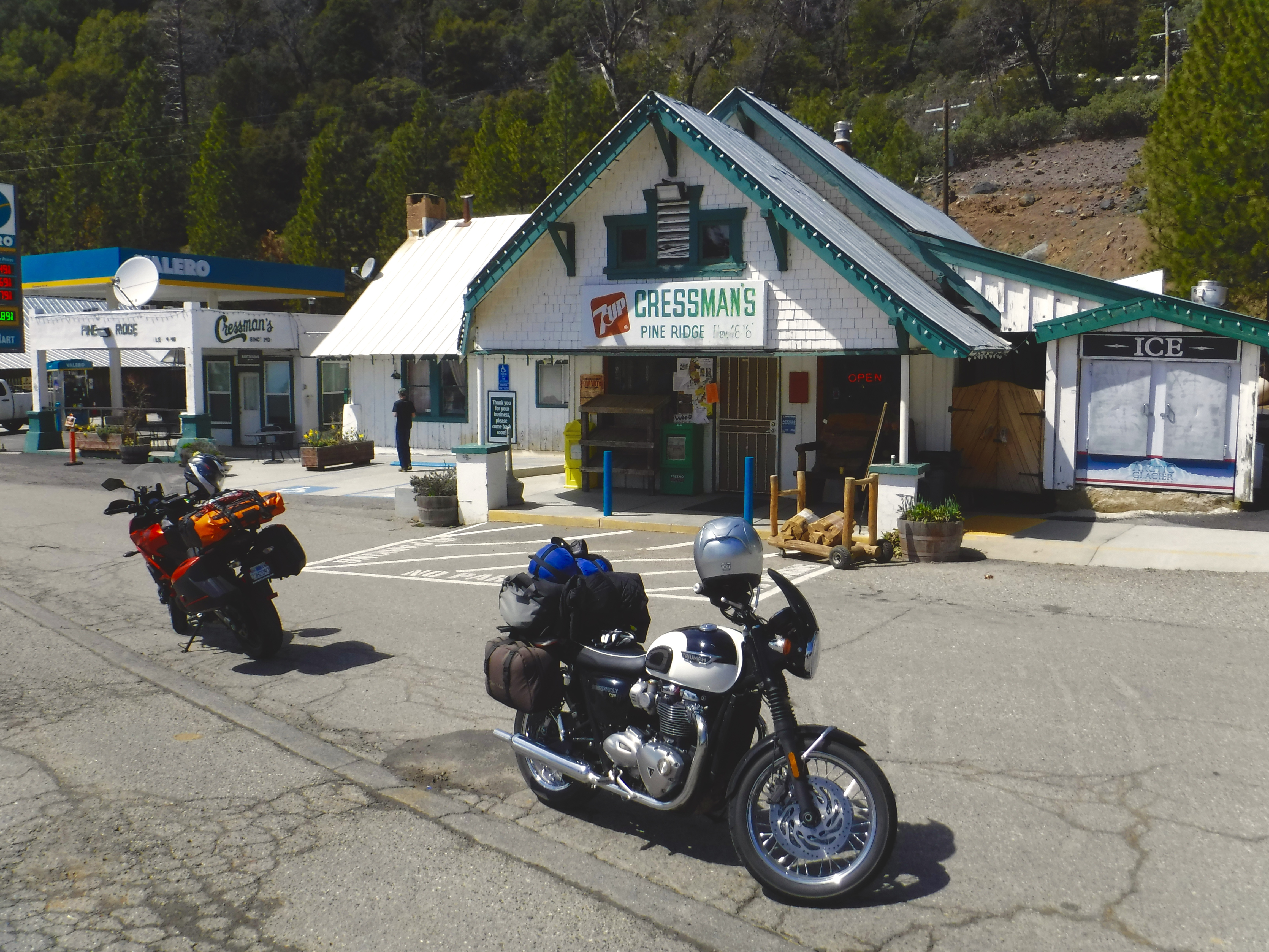 More twisties up Rd. 274 to Bass Lake and Yosemite Forks where we joined SR 41 through Oakhurst zipping onto SR 49 into Mariposa for petrol for the Triumph.