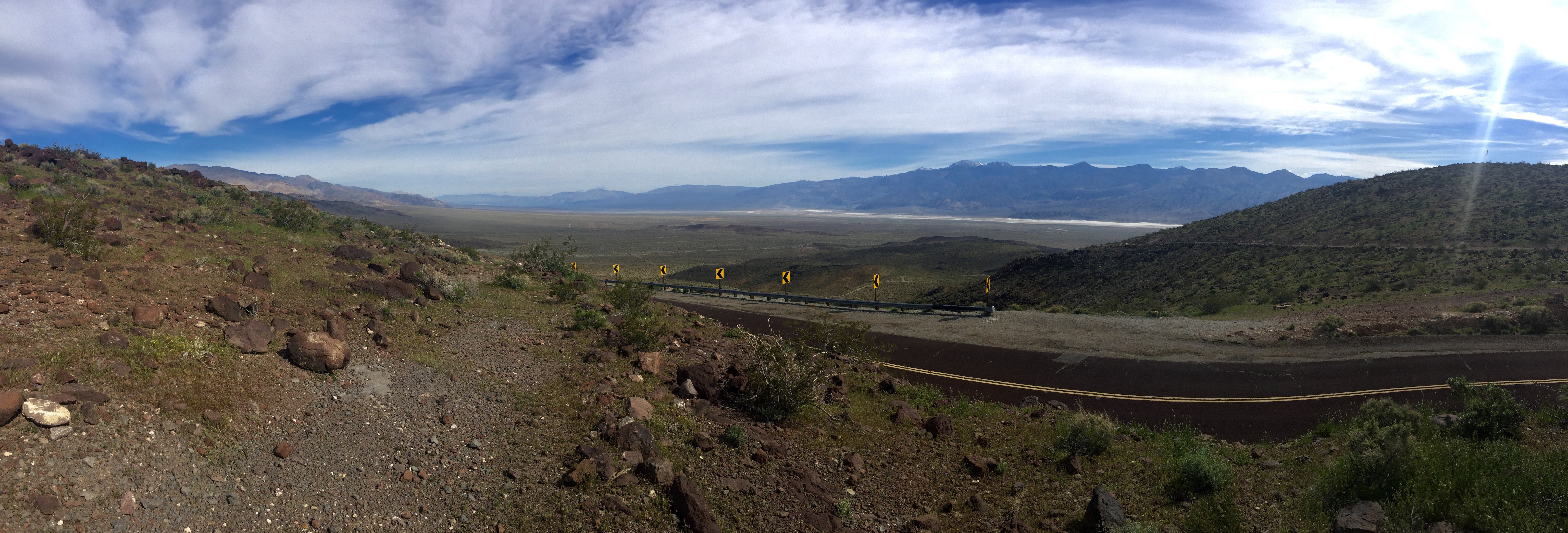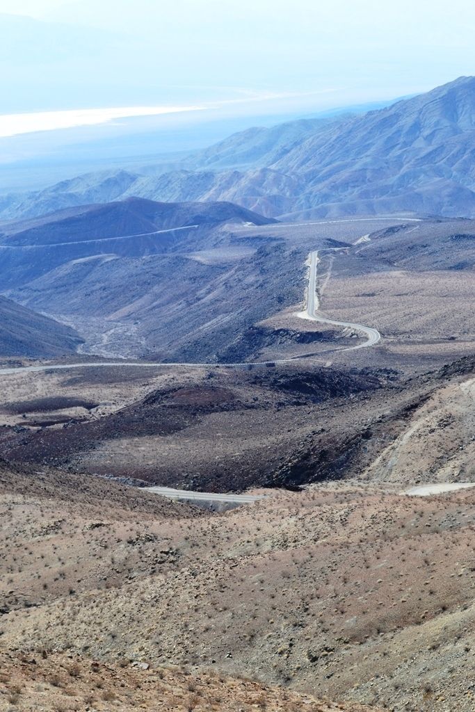 As we began the descent into the Death Valley Monument the winds tapered, yet once again our desire to lean into the twisties was stymied by a group of gentlemen tourists cautiously riding their shiny Harley Davidsons as we shared the road. Once again we enjoyed the vistas freed from having to determine the line and apex of the next turn.