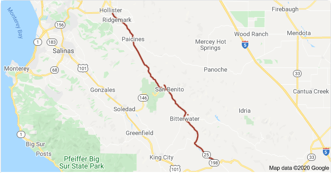 Sadly, our traditional burrito breakfast at the Paicines Store was foregone in observance of the plague.  This was just a “stretch” stop after the 18 miles of twists and turns of Old Panoche Rd.  We have in the past had to head north a few miles to Tres Pinos for fuel when heading down Hwy 25 on previous trips when Pete was traveling on his volume challenged Bonneville T-120 gas tank.  Confident that our 5.5 gallon tanks on the Kawasaki Versys 650 and Suzuki V-Strom 650 could get us all the way to Coalinga from Merced, we headed south on Hwy 25, aka the Airline Highway, via the Coalinga Rd to where else ?  All the while, *novel virus free.