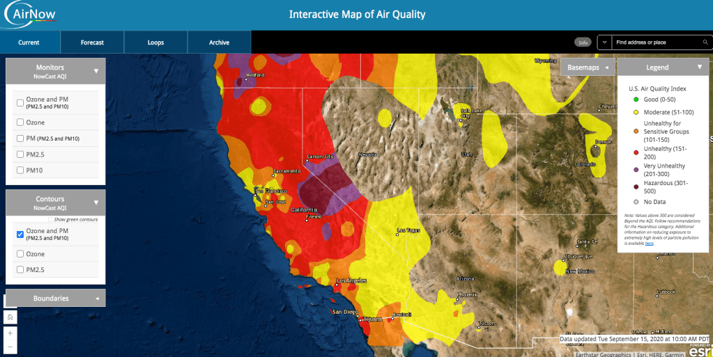 Given the Air Quality Map (see above from Sept. 15, 2020) I’m not sure what the air will be like in midish-October when Pete, Andy, and I have agreed (and have homestead clearance) to take a little road trip. It looks like our best bet, based on the combination of climate, fire, and geography, at least since the beginning of September, would be to consider Nevada and Utah. And so armed with masks and riding no closer than 6 feet apart we intend to Go East old fellas, go East!