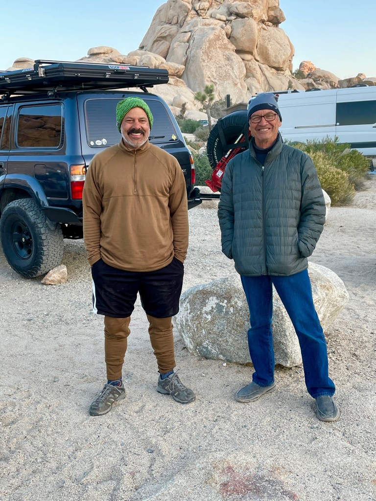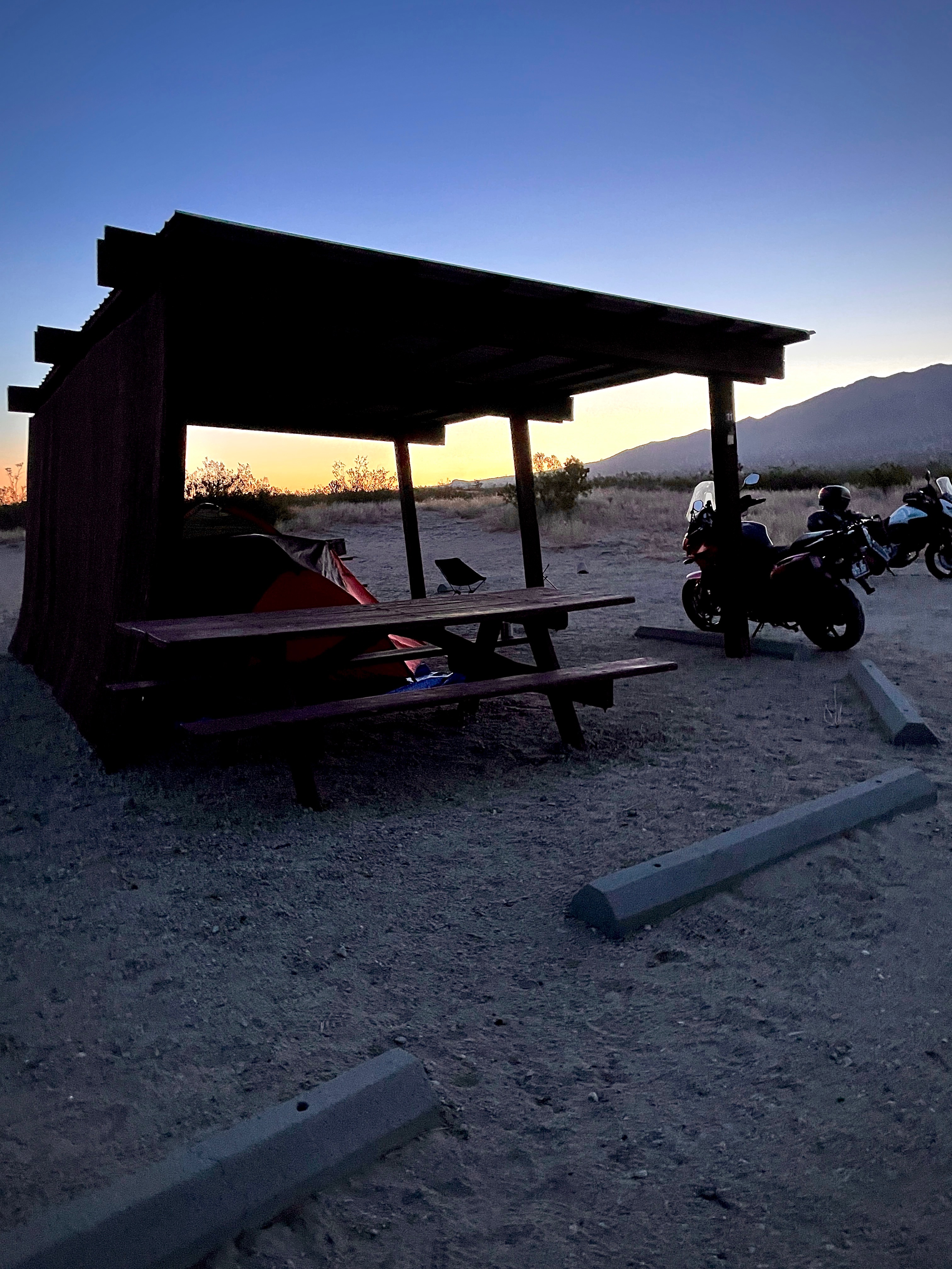 We rode to the Totem not far from the park entrance for an excellent buurguur and beverages. Returning to camp we met our neighbors and new friends, Gabriel and Roxi, and inspected their very cool wedge tent mounted just above the bed on their Colorado crew cab complete with a Yeti cooler that could take a week in the Mojave on a single block of ice keeping the beverages at the ready for relaxing, reflecting, and rehydrating after a rigorous day of exploring.