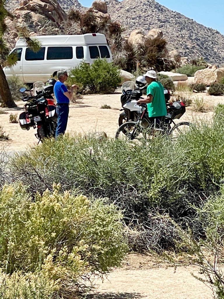 Arriving at the campground a more official permanent “Campground Full” sign would not deter us from taking the one way road through the campground to exit, though crestfallen. But as serendipity was infusing the gentle desert breezes, the first of two of our newest best friends stepped onto the road and waved us to stop. When Andreas asked if we were looking for a place to camp, even though I really couldn’t hear his invitation wearing earplugs and head nestled in helmet, I was elated to accept whatever it was he was offering.