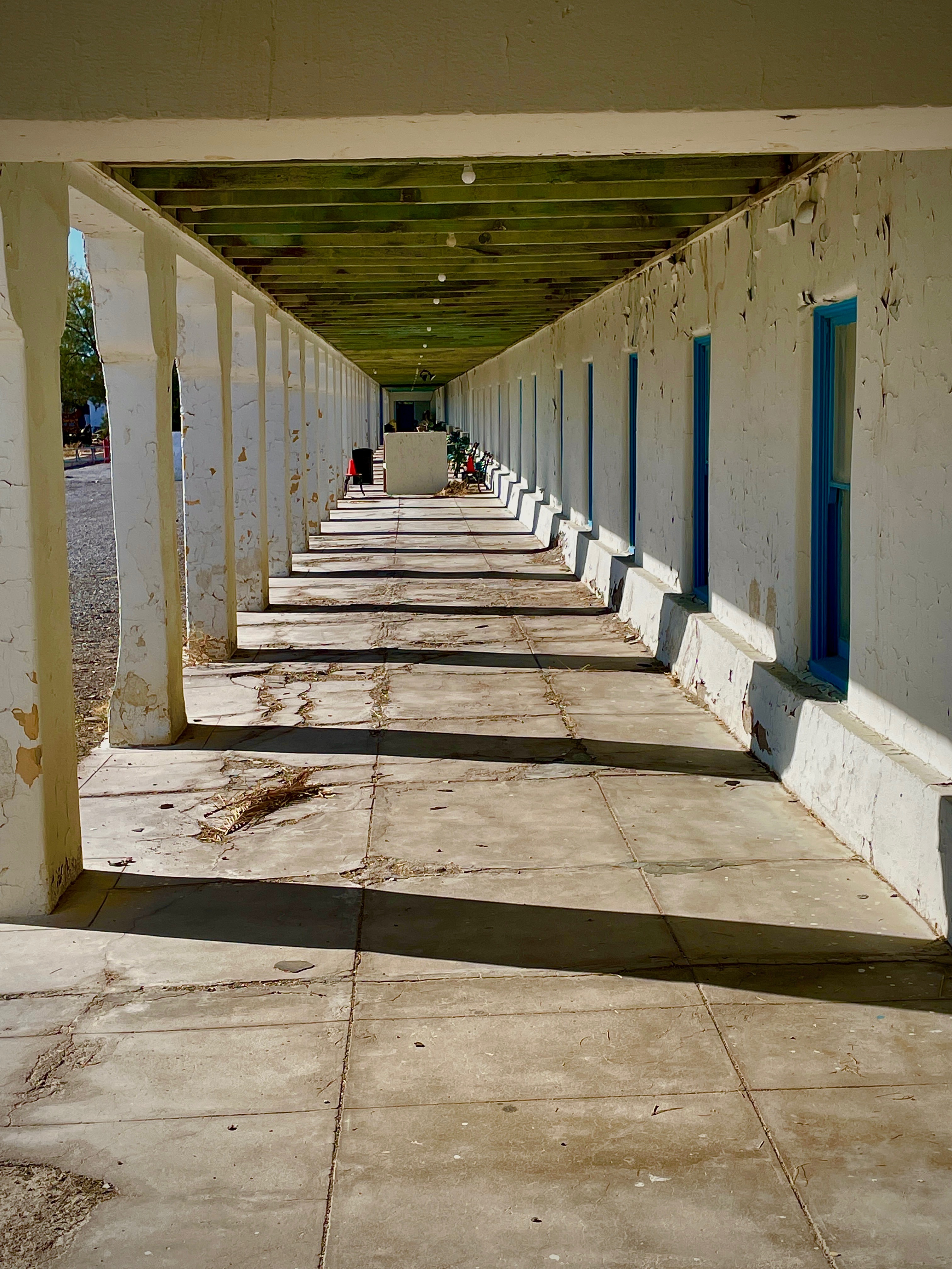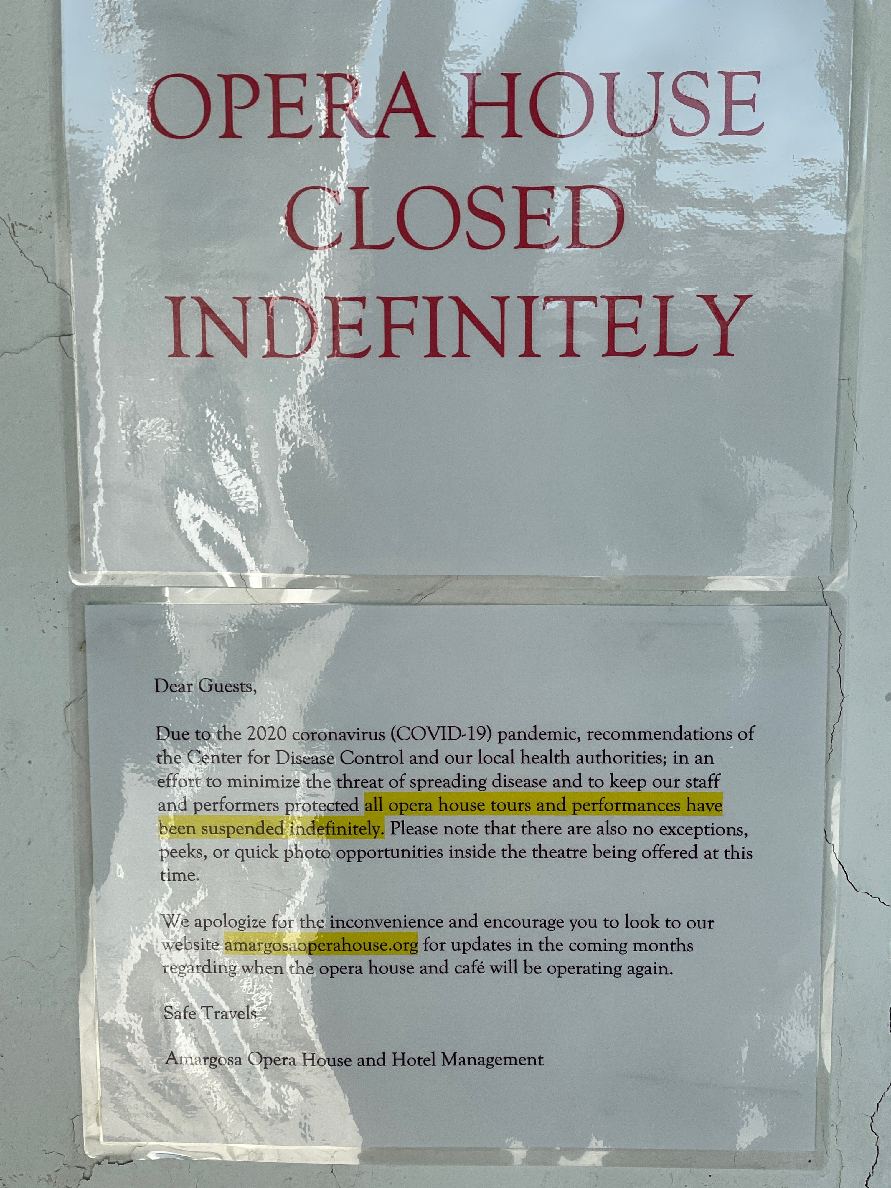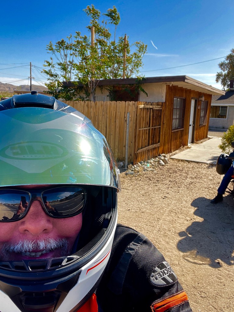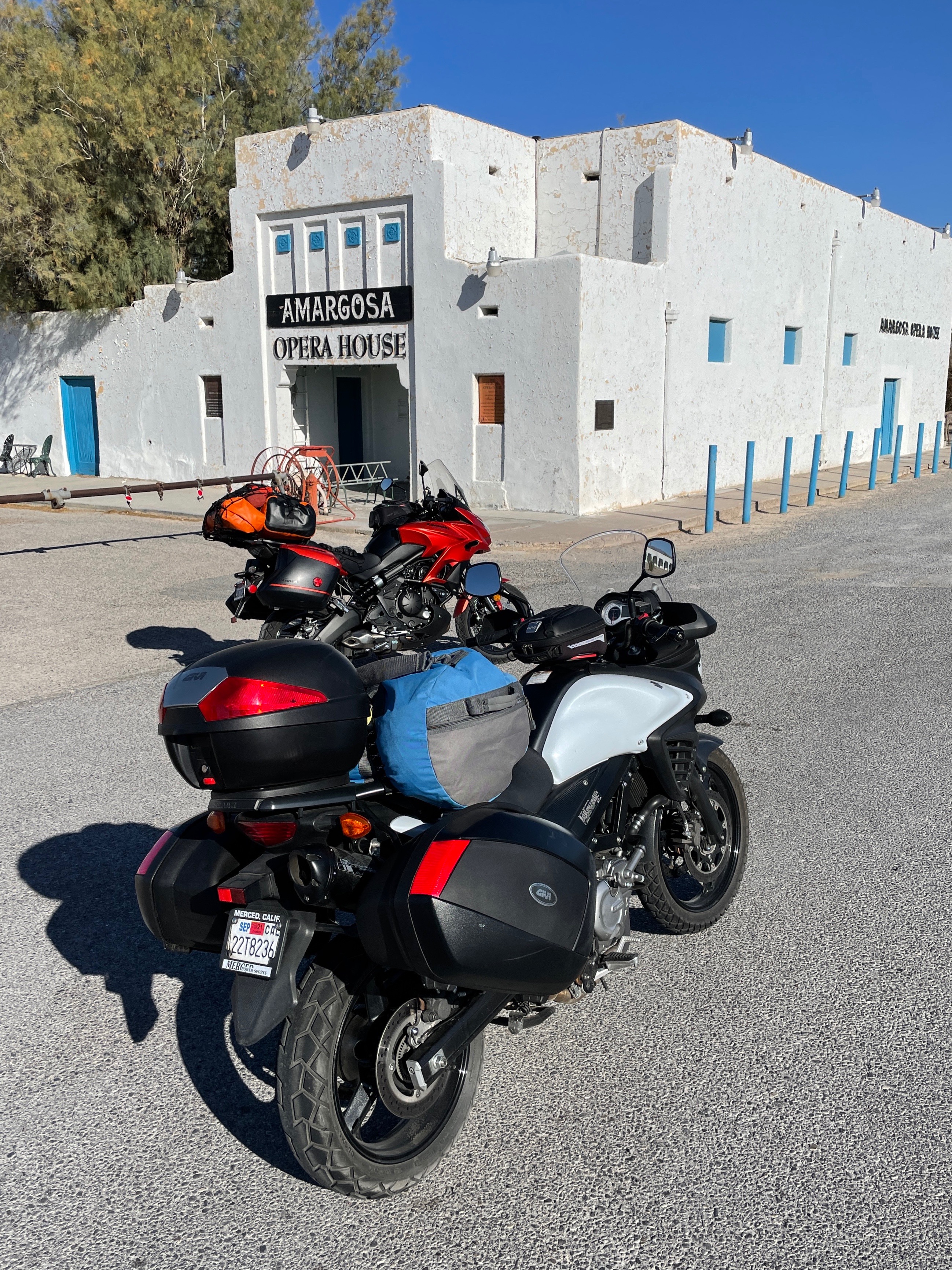 What would be day in which all of the experiences would be tossed into a blender and later enjoyed as a mental smoothie began with revisiting The Amargosa Opera House in Death Valley Junction (See a previous post from December of 2019, Riding Under a Fool Moon for context). In October of 2019, a full moon on October 13 would cast a supernatural lucence over Death Valley and so Andy, our third moto-buddy unable to make the this Mojave trip, proposed we ride across the Valley floor, bajo la luz de la luna llena. That fall trip was to be followed by a Winter/Spring ride across the desert that was cancelled, a victim of the pandemic, that we were now reprising. Before riding into the night to Beatty, NV, we stopped at the Opera House to put on every stitch of warm clothing we packed to make final the 50± mile trek to the Atomic Inn.