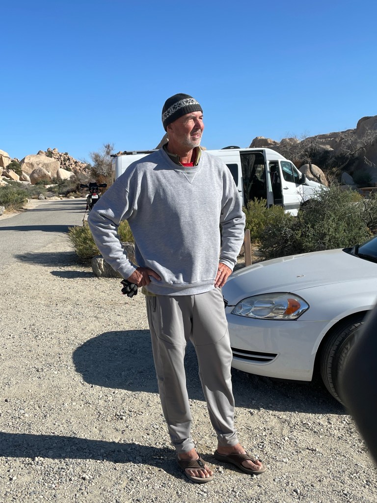 We met our next new friends in Stovepipe Wells where we had stopped for caffeine as the warming temps were inducing Jones DPRoC drowsiness. Drowsiness and operating machinery are incompatible so stopping to peel off the cozy sleepiness inducing layers protecting us from the morning cold as the thermometer pushed 90 degrees was imperative. Leaving my jacket and phone on the table outside of and around the corner to the market’s entry, then sitting in rocking chairs placed under the shade of the porch in front of the market to enjoy a Cold Brew (for those who do), a thoughtful young woman and her partner came around the corner to alert me to having left my phone on the table, unguarded. See what kind of careless behavior drowsiness induces!