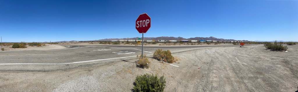 These roads, similar to the Jones PARoC’s classification, might best be described as Paved Desert Roads of California or PDRoC’s. I may just be splitting hairs with the Butler folks who might argue that these are simply Lost Highways. The romanticism of a Lost Highway is misplaced on these roads that also share features with PARoC’s, namely, two lane roads astoundingly arrow straight with right angled intersections, sometimes paved often not, bordered by mirage obscuring sight lines and stop sign, yellow double line disregarding, pucker inducing impatient cagers and semi drivers of questionable sobriety trying to pass anything with ≥ 2 or ≤ 18+ wheels. At least if a threat was approaching one of these intersections from a dirt road, we’d have a warning dust cloud.