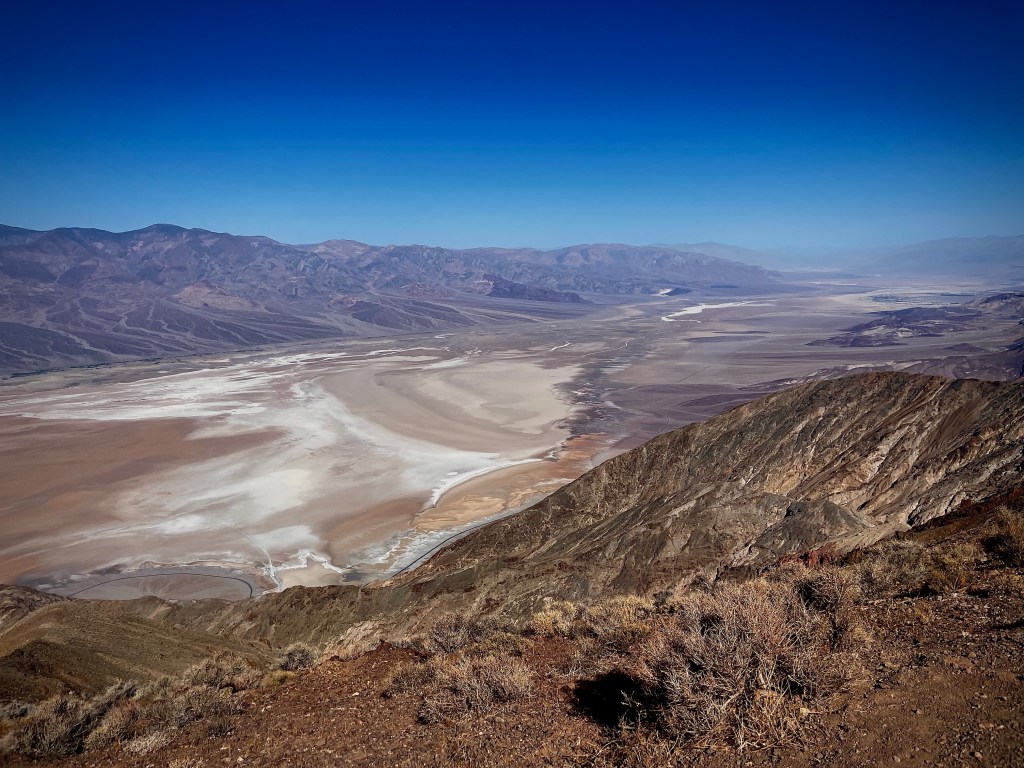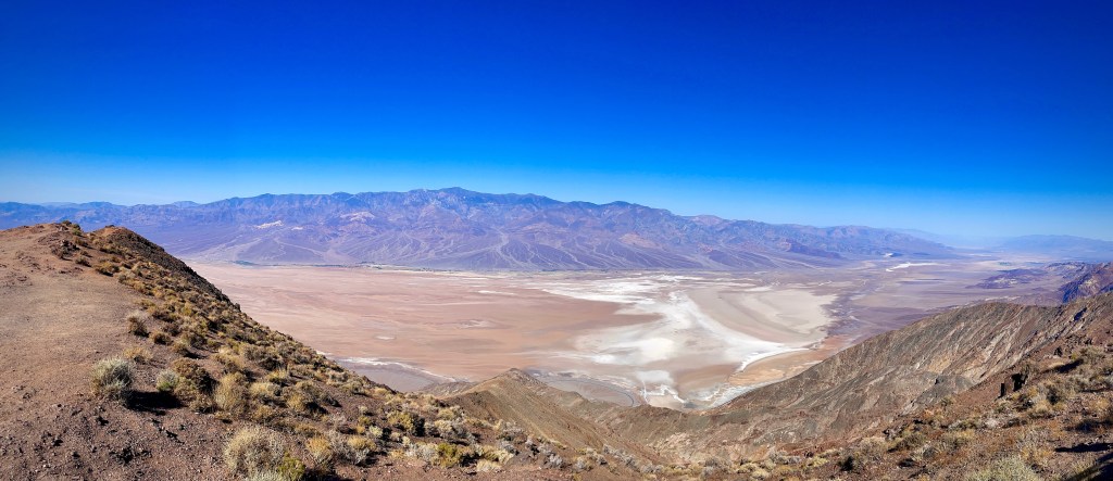 I immediately received a series of four telephone calls from the 911 dispatcher, apparently trying to reach me to confirm an emergency. Pahrump was the same distance, some 30 miles, as it was to Furnace Creek. I guess the feds don’t dispatch emergency 911 services from Death Valley if one hasn’t crossed into park boundaries. I was apparently only a mile or two from the park boundary when the accidental alert was transmitted. A few miles later there was a turnout at an abandoned campground, now a boondocking community. No wifi or cell service was available. How do these people watch Netflix? It wasn’t until we reached Dante’s View that I had cell service and sheepishly called the 911 dispatcher to let her know that a terrible mistake was made and I appealed to her for mercy. She casually said, “I’ll put you through to the Deputy we sent out and you can explain…” This, I felt, was worse than having to go to the Principal’s office.