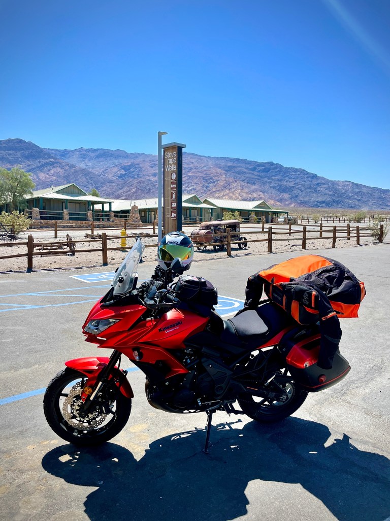 Parking lot date palms in Furnace Creek and a reliable Japanese moto, the Kawasexy Versys, in parking lot at Stovepipe Wells
