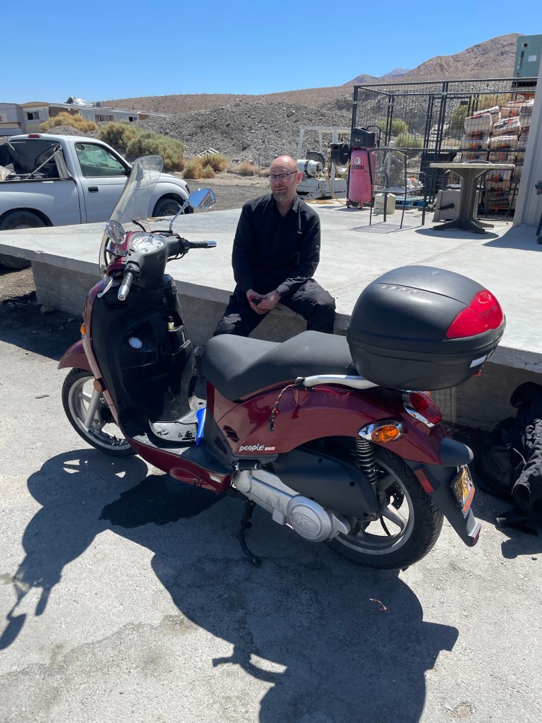 You may have noticed a fluid spill beneath his Kymco Peoples 250cc scooter. It was a problem that developed in Death Valley involving an oil/coolant mixture that began to cause problems with the engine… running. Dave and his scooter had made it all the way from Portland. It was the informed opinion of the jack-of-all-trades Panamint Springs maintenance guy who pressure tested the engine that the People’s death was immanent. Being in a spot, Dave who noted that he was due to be in Asia in a couple of weeks was considering his options. Consensus arrived at there appeared to be three. The first was to try limping into Olancha or Lone Pine uphill 50± miles on Hwys 190 and 136. The single feature of this option that increased its worthiness is that cell reception could be had at the Father Crowley Overlook should he need rescue at the top of the most extreme slope. However, there was no place to repair the bike in either Olancha or Lone Pine, even Bishop for that matter.