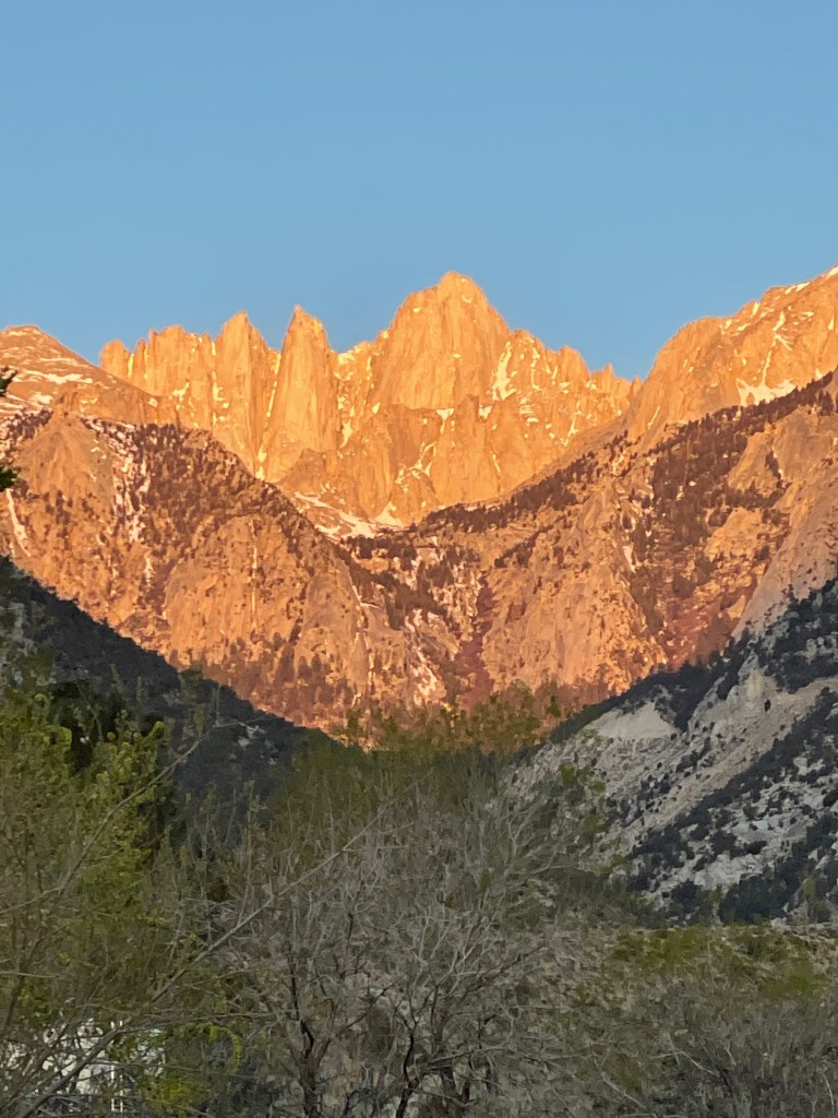 From Keeler we whipped into Lone Pine around the Owens Lake stopping at the USFS Eastern Sierra Visitor Center to check on the best shot at getting a campsite. The Lone Pine campground was recommended and so off we rolled. Upon arriving we found the campground to be attended but not crowded and its layout conducive to semi-privacy along Lone Pine Creek. The afternoon view of Mt. Whitney from the campground as shadows began falling across the canyon portal were stunning.