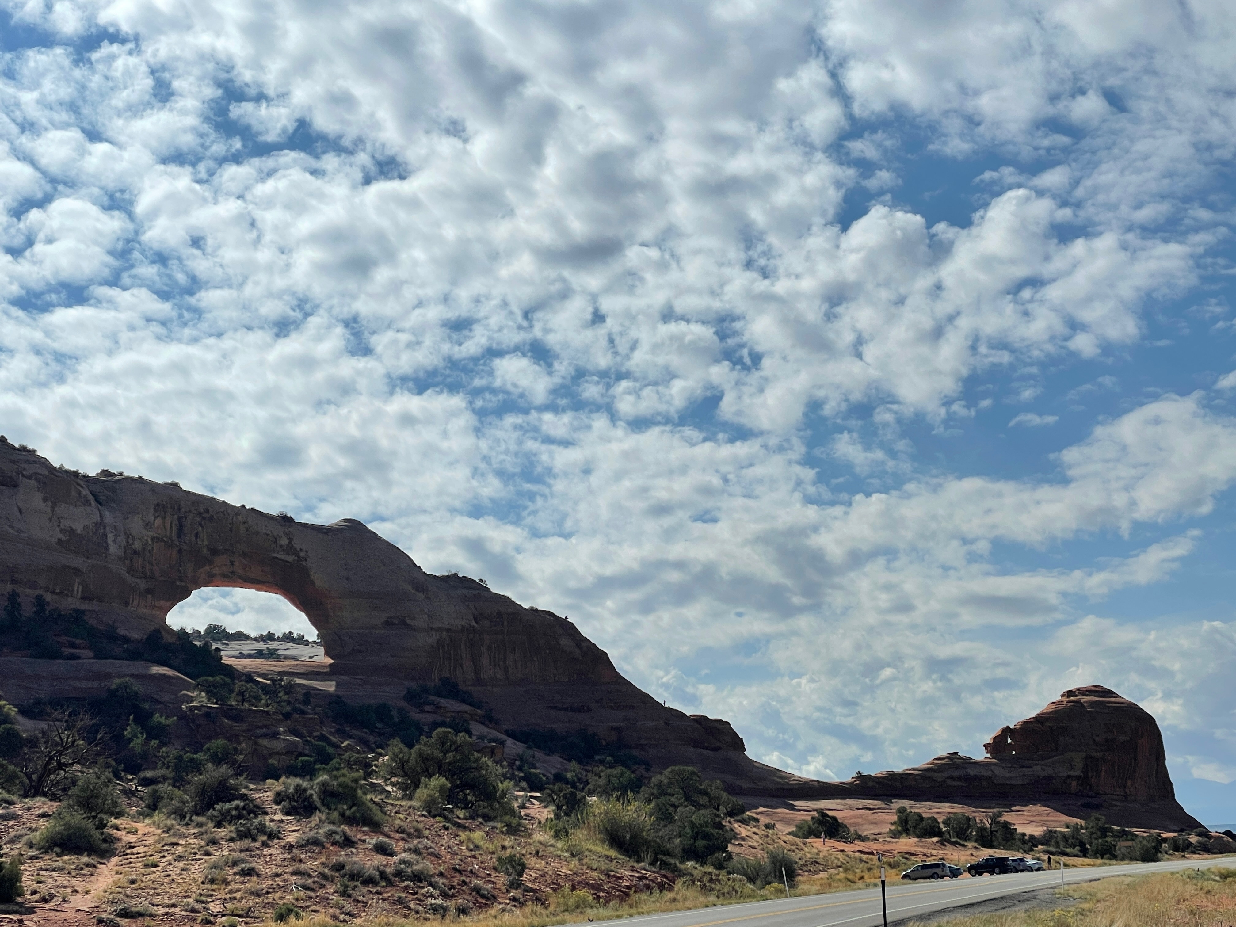 The next day took us through Moab and fortunately, the rain of the night before had moved east and the earlier forecasted showers arrived later that afternoon. It was here we had our first sighting of the mighty Colorado River having crossed the mighty Green River earlier. Well, historically mighty. Drought has rendered most of the west’s mighty rivers turbid. Mt Tukuhnikivatz to the east, however, was crowned with a late September dusting of snow. The precip was welcomed despite having to ride later in the day through showers on two wheels, thankful for this morning respite.