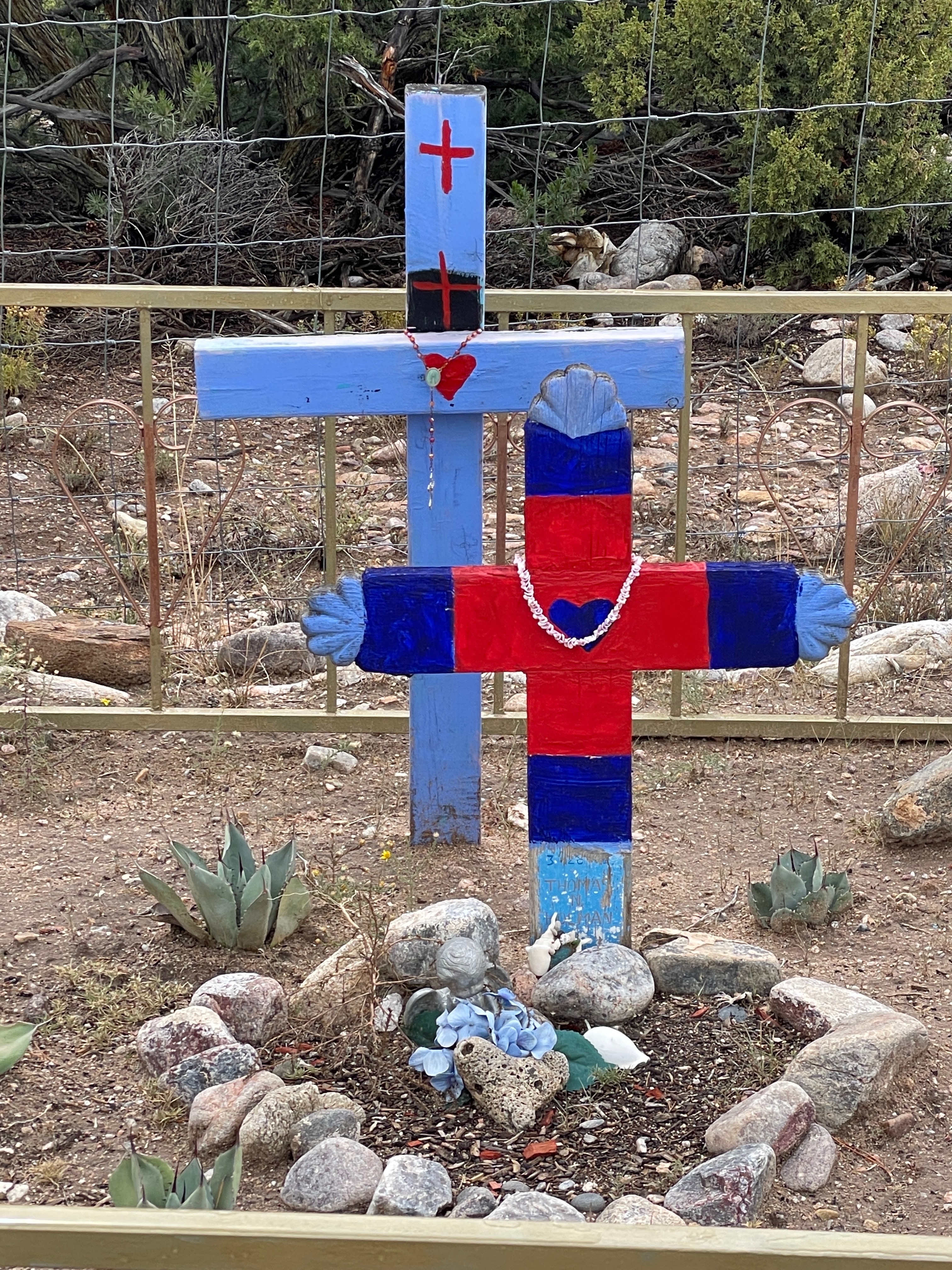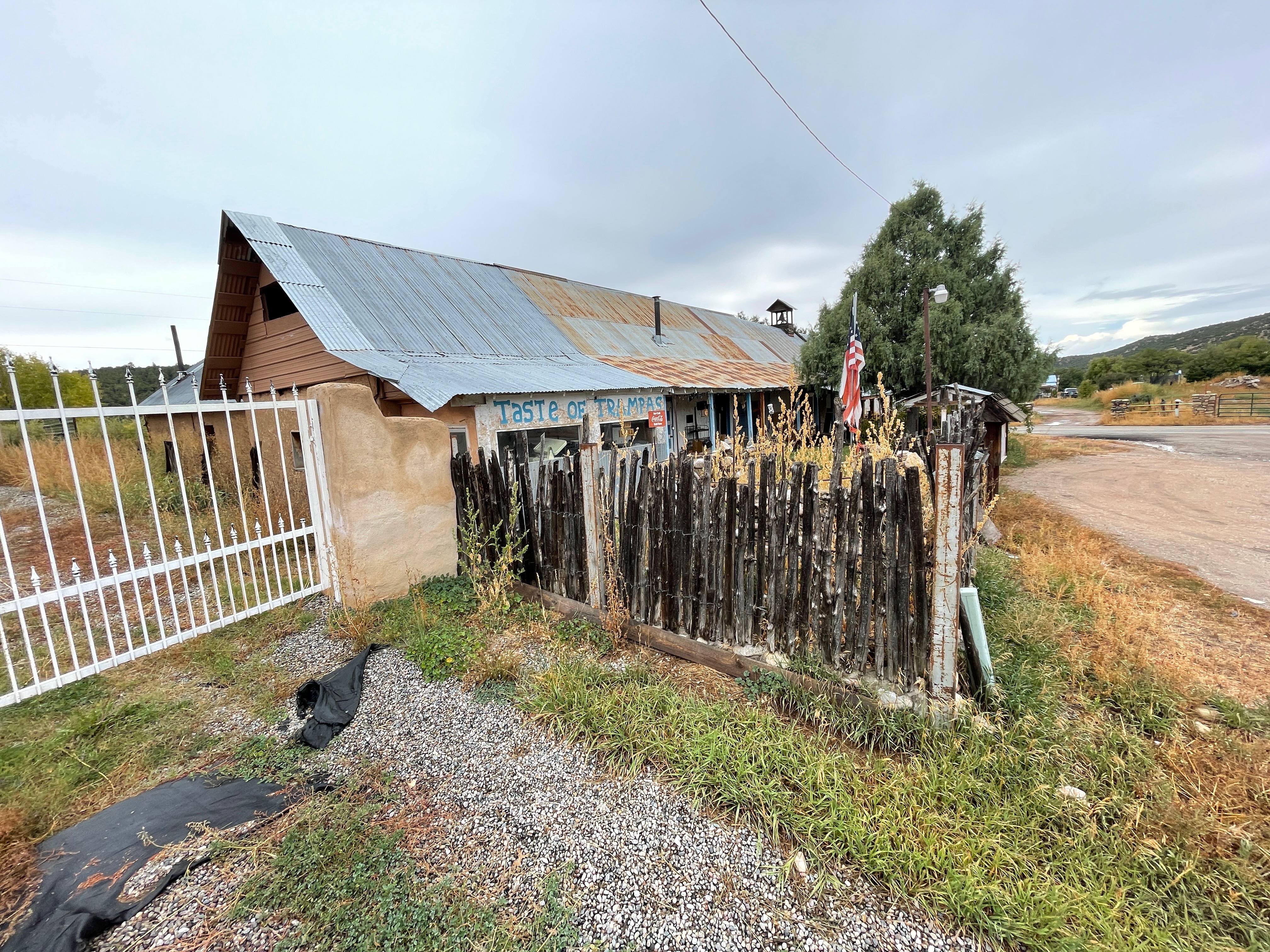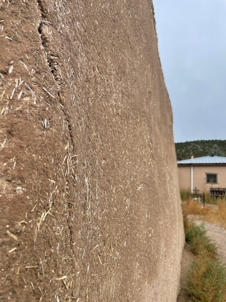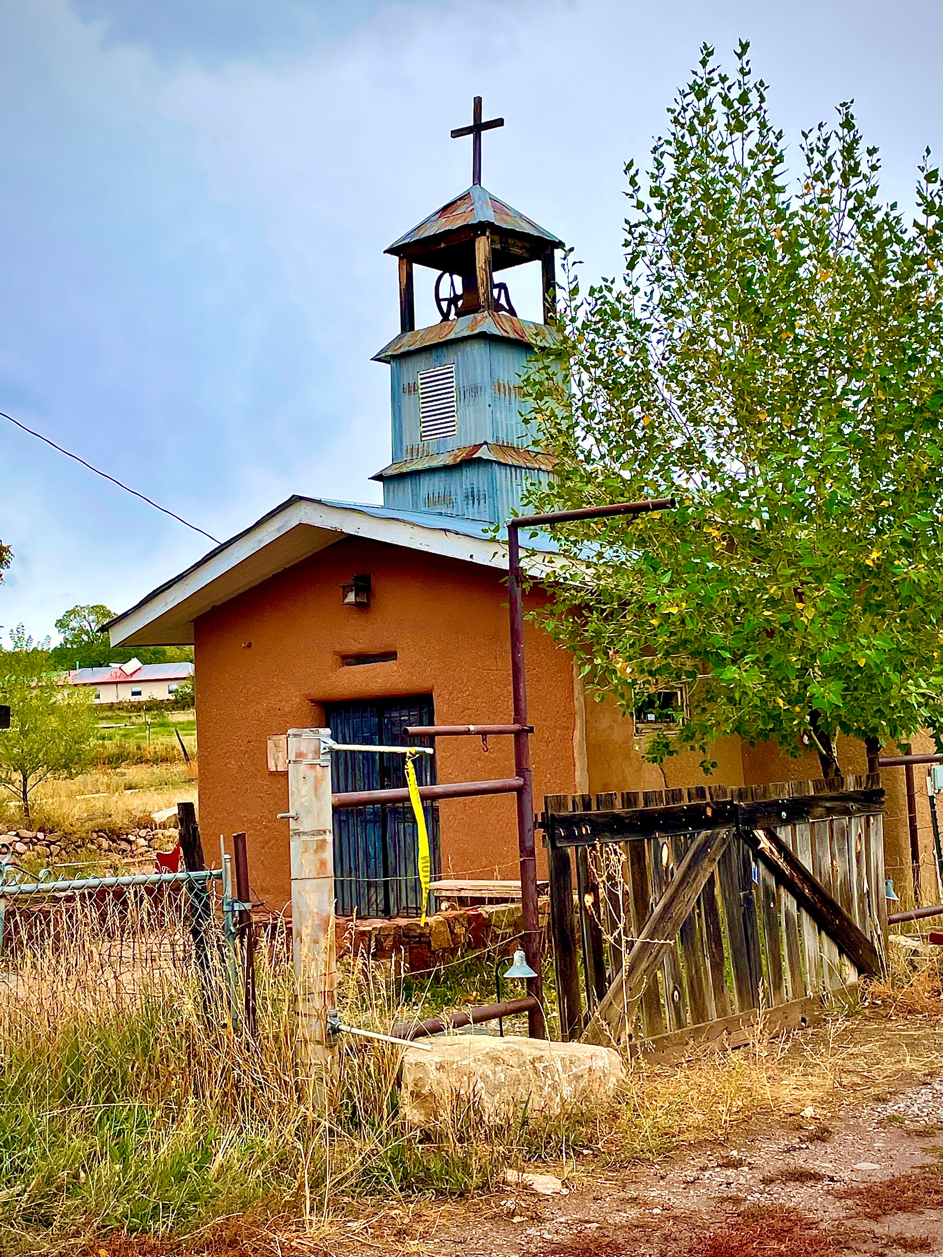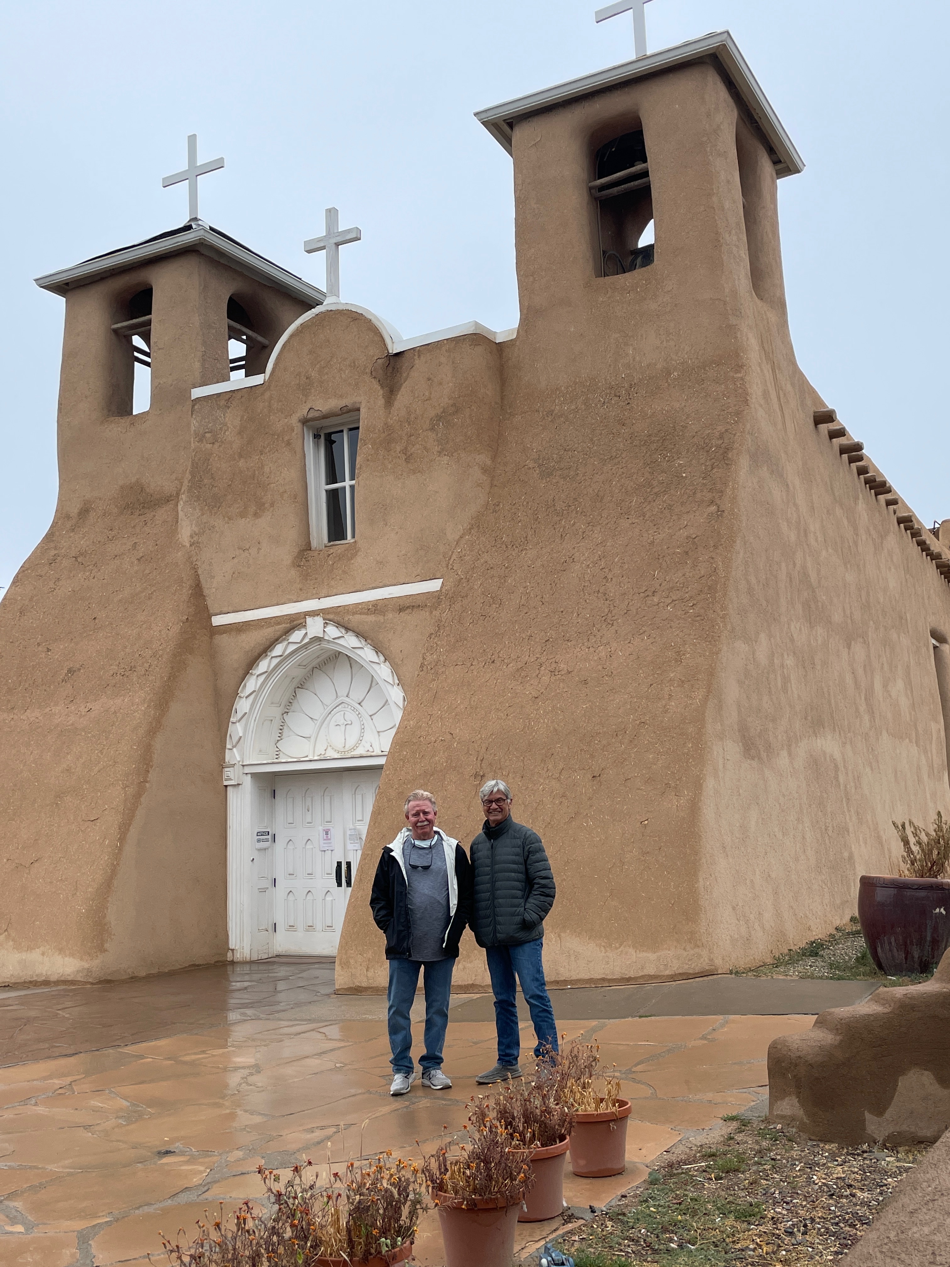The next day we arose to yet more inclement weather. That wasn’t going to deter Bob from chauffeuring us along the the High Road to Taos, a most scenic byway. We enjoyed this authentic remnant of Old Spain, still evident in the religion, architecture, topography, history, and people along the real. The byway travels through Chimayo, a community known for the beautiful Santuario de Chimayo, a national historic landmark, and the El Posito, a hole in the floor of a side chapel filled with healing earth. Along NM-76, the byway follows the terrain; the creased and wrinkled badlands populated with scrubby pinon and juniper, with the Jemez Mountains enormous on the horizon if it wasn’t for the clouds.