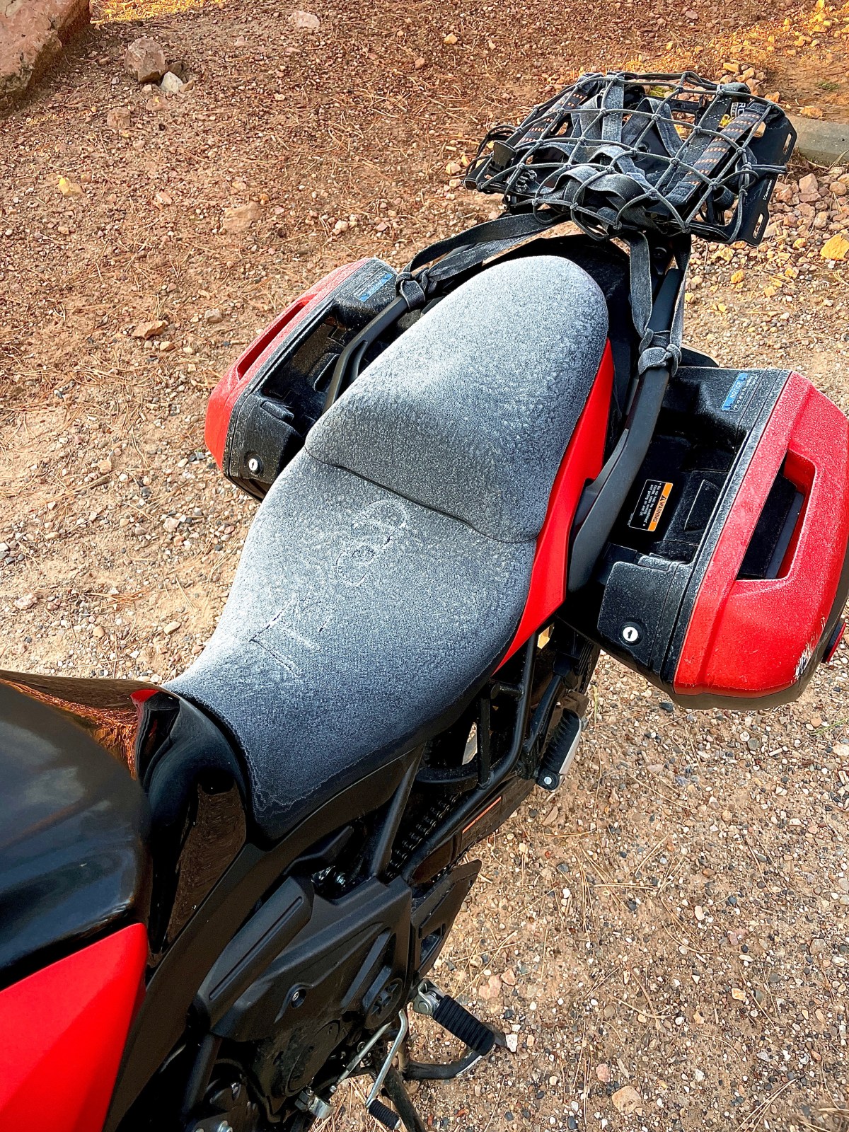 Absent from the picture are the additional clothing, tools, technology, and other assortment of “stuff” that added approximately 85 pounds of gear in the panniers, dry bags, and tank bag to the 25 pounds of the armored jacket, pants, helmet, and boots worn for protection while riding. Including my weight, I added 290± pounds to the svelte, 473.6 pounds of the Kawasexy Versys. I added 61% of the weight of the bike just in my nalgas and gear. That’s a whopping 864± pounds when you add in the fig and Kind bar snacks. Given the high center of gravity of the bike and all of the gear, it makes for anxious low speed maneuvers on stable, much less unstable, ground, paved or otherwise. I do my best to avoid the Flexlite manuever on the loaded Kawasexy.