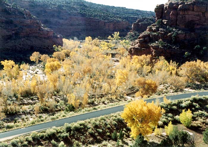 Day 5: Spin 12 easy miles back to Hwy 276 and continue east on Hwy 95 past the Natural Bridges cutoff (Hwy 275), the Mule Canyon Ruins, the Arch Canyon Ruins, and the Butler Wash Ruins to Hwy 191 at Blue Mountain (el. 6000’± just south of Blanding. Take Hwy 191 south to White Mesa. Turn left (east) on Hwy 262 for a while (9± miles) then take the road that leads to Hovenweep National Monument (more ruins) on the UT – CO border. Pack ’em up and head south and west through Monument Valley, Page, and Zion National Park to St. George or thereabouts. Find a place to stay… Distance: 93 miles, it’s more or less 396 miles total. Terrain: It’s probably all paved… rock and roll, watch out for Navajos.