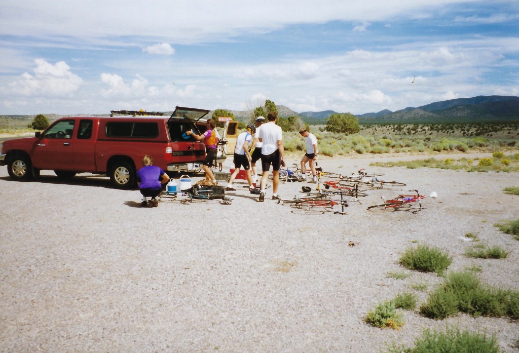 The south and north vehicle people have each been asked to provide a large water container (5+ gallons), bike tools, two ice chests and a floor pump. The south vehicle has been asked to provide an extra set pf wjee;s (one front, one rear). A CB radio will be available for each vehicle at Panaca (via Larry).