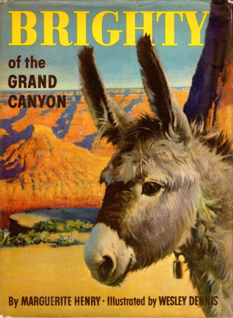 My affinity to this place is lodged in my fond regard for Marguerite Henry’s children’s book, Brighty of the Grand Canyon, that I loved reading aloud to my elementary students. Brighty is a tale about a “lone little burro that roamed the high cliffs of the Grand Canyon and touched the hearts of all who knew him: a grizzled old miner, a big-game hunter, even President Teddy Roosevelt. Named Brighty by the prospector who befriended him, he remained a free spirit at heart. But when a ruthless claim-jumper murdered the prospector, loyal Brighty risked everything to bring the killer to justice.”