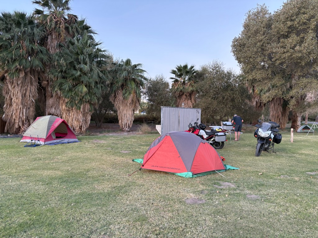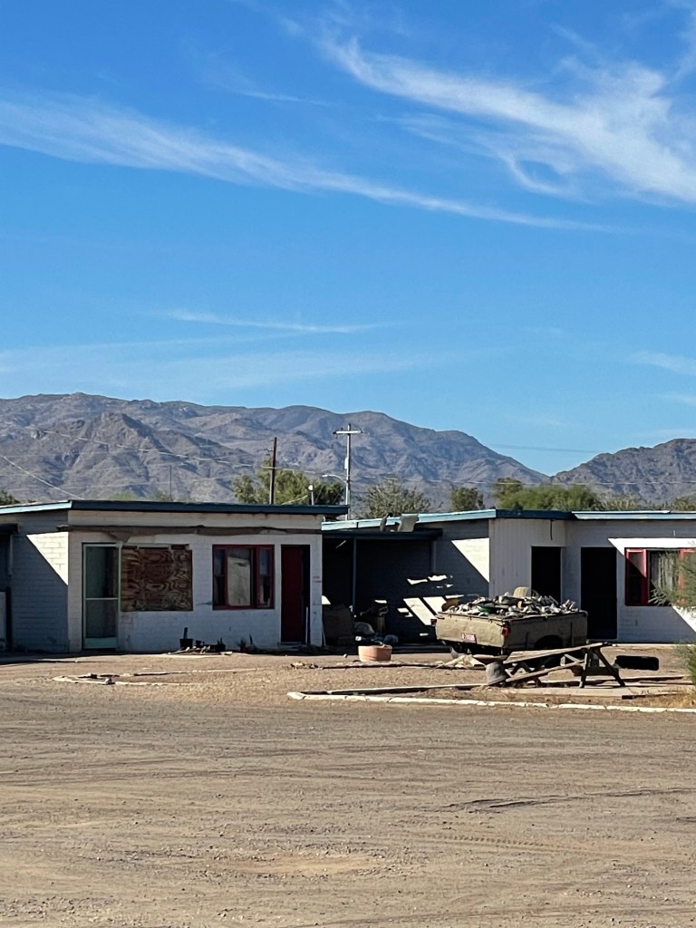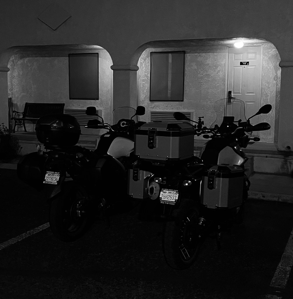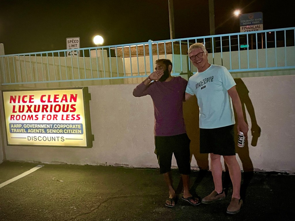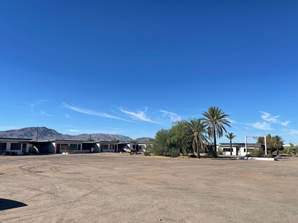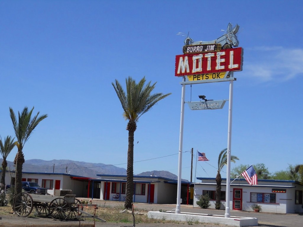 Finding the right accommodations is always an adventure on our moto tours. While I had previously stayed at the venerable Burro Jim Motel back in 1996. Burro Jim was another 84 miles down the road and so since it’s generally not advisable to ride a motorcycle through the desert in near 100 degree heat for nearly 400 miles, instead, we opted for the Budget Inn in the heart of Parker. In hindsight, I should have checked my old bicycle trip itinerary, as the Kofa Inn may have been the better choice. Alas, the Budget Inn, while functional, definitely lacked the neon “colorful funkiness” of the Kofa, it has fared better than the Burro Jim.
