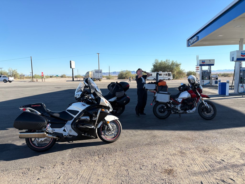 East of Twentynine Palms, we found ourselves on what is best described as a lonesome desert road. At the intersection of CA-62 and US-95 at Vidal Junction, we stopped for some “nalgas relief” (Spanish for “ass relief”) and a refreshing agua fria. There, we met a friendly woman trucker hauling produce from Fresno eastward who commented, having witnessed our pained expressions as we dismounted our motos, that our sore backsides were likely just as weary as hers. I imagine her air-conditioned cab compensated of any nalgas disorders…