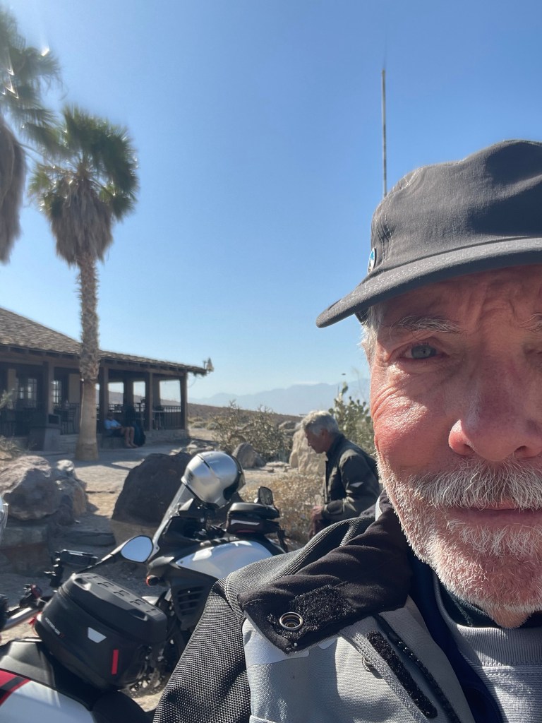 Setting out, the predicted winds materialized and our ride down Panamint Valley and Wildrose-Trona Rds eventually to CA-14 and CA-178 over Walker Pass was like riding a bucking bronc through drifting sands obscuring the road with fine dust breaching the seals of our helmet’s visors. I’ve ridden in rain in the Rockies, fog in the Central Valley, searing heat across the Mojave, and snow flurries on the Paunsaugunt Plateau. I’ve pedaled across the Big Horn in Wyoming in a thunder shower with hail pelting me on a bicycle, exposed to lightning. I’ve weathered a Sierra thunderstorm and cross country skied in a whiteout. Maybe because I survived all of those, my fear of calamity was only slightly moderated. I was scared s*#tless. But, as of this writing, I survived!