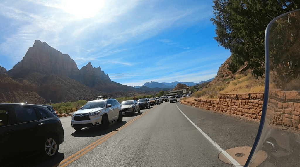 However, by the time we made the 26-mile ride to the Zion-Mt. Carmel Tunnel entrance on the east side of the park, the number of cars, trucks, trailers, and RVs had multiplied exponentially. Most of these visitors had entered the park from the western entrance near the town of Springdale. Virtually every turnout was choked with people waiting for a parking space to open.