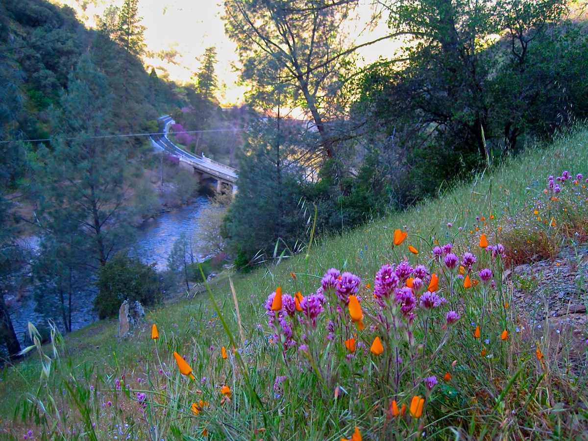 The verdant spring grasses and wildflowers were a visual feast. We took Pool Station Rd back to Hwy 4 and Copperopolis where the traffic was equal to that on Hwy 49. O’Byrnes Ferry Rd skirted Lake Tulloch to Hwy 120. Hwy 120 to J-59, La Grange, Snelling, and home.