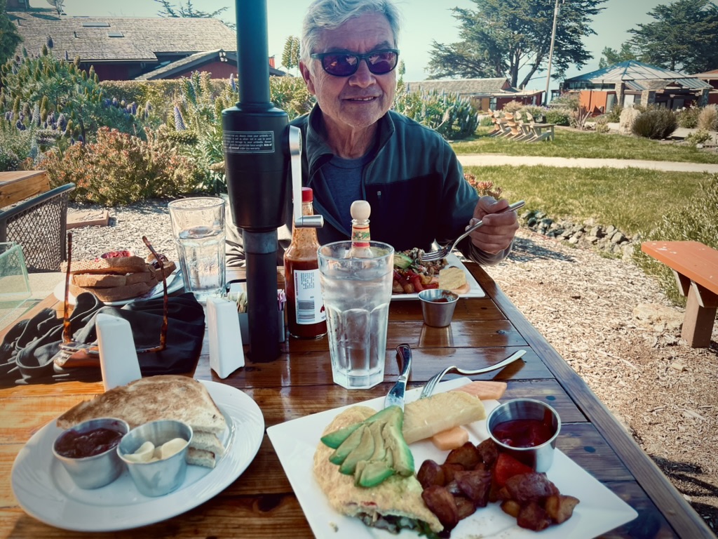 We stopped at Ragged Point for breakfast on the recommendation of our camp hosts. We dined alfresco perched on a rocky headland that marks the southern end of the small bay where San Carpoforo Creek empties into the Pacific Ocean. The Ragged Creek Inn Resort was built by Wiley and Mildred Ramey starting in the late 1950s on property that was formerly part of the Hearst Ranch. Our breakfast was only exceeded by the view from the rugged cliffs above the Pacific.