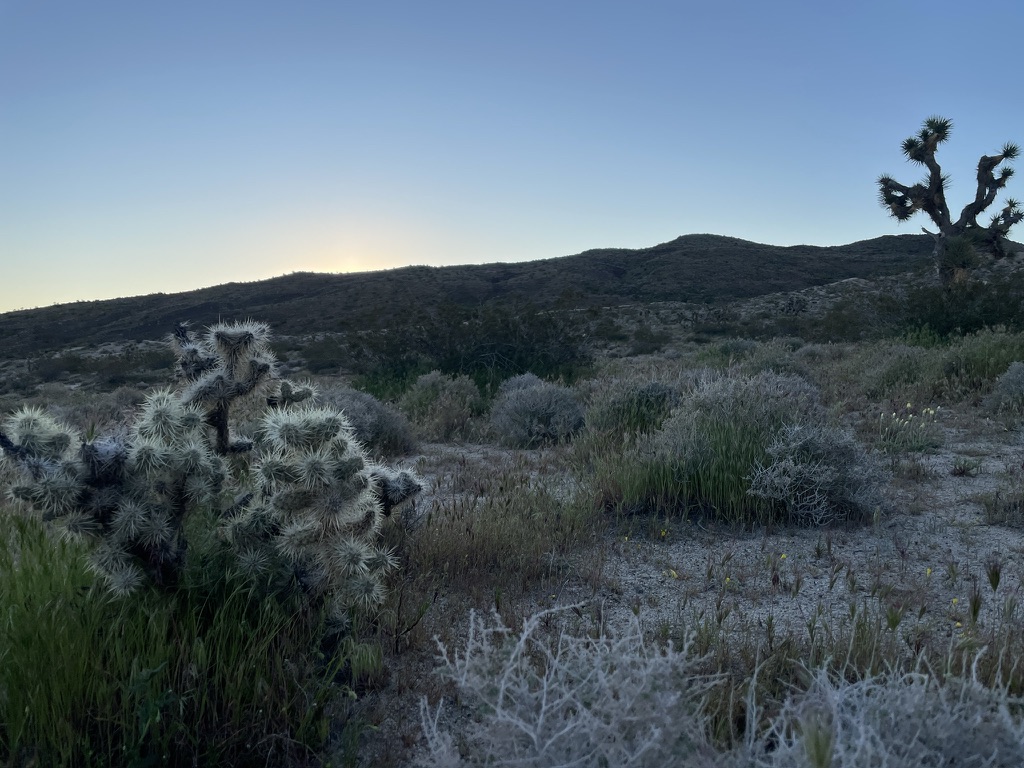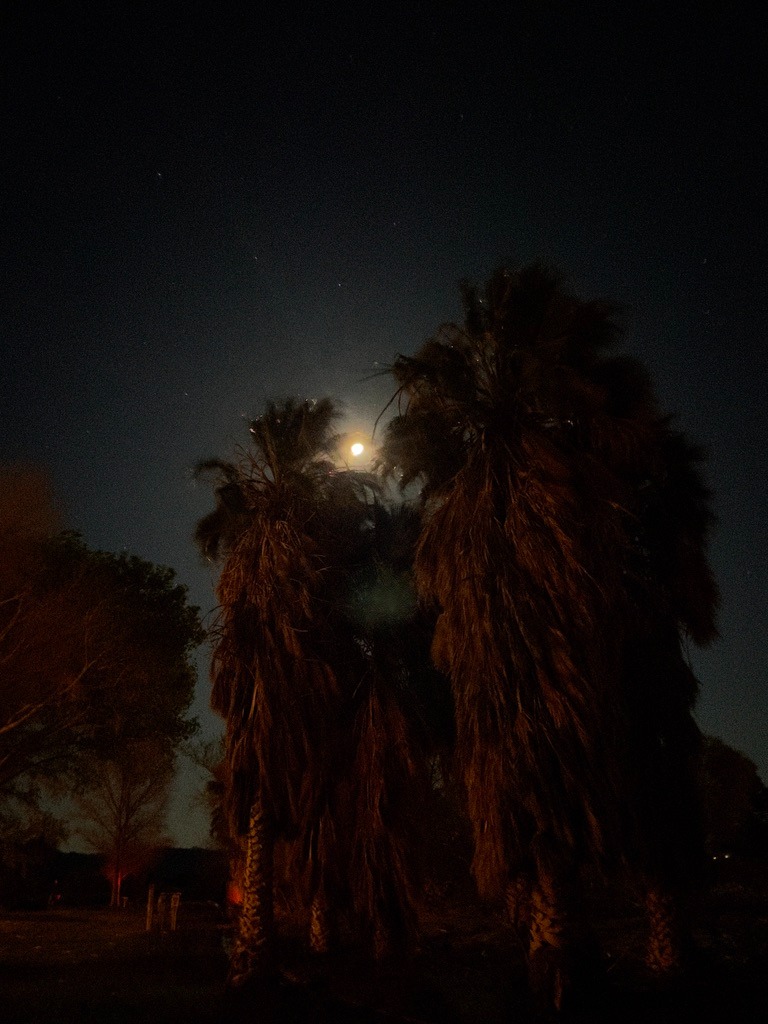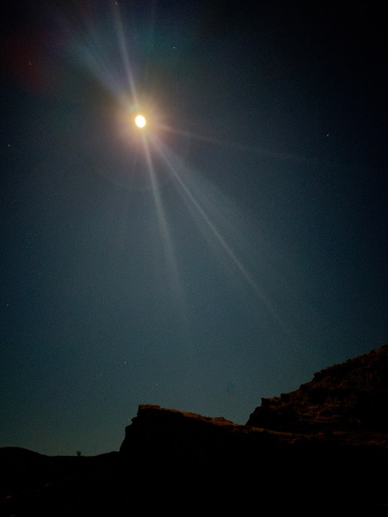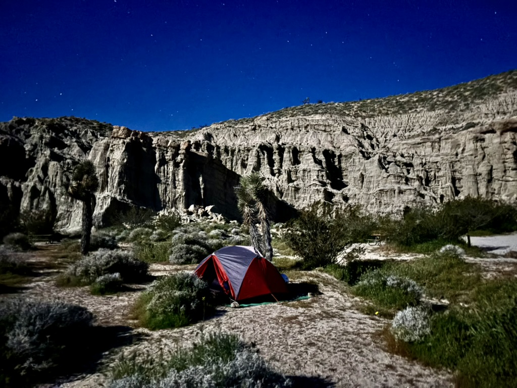 We were fortunate to have a full moon that would eclipse, making for a blood moon later in the night.  After relaxing and rehydrating, we reflected on a fellow camper’s hike to a surrounding hilltop vantage earlier.  We hiked up above our campsite where cell reception and quick check-in with the home fires was complemented by stunning views south to California city and the campground below, all illuminated by moonglow!