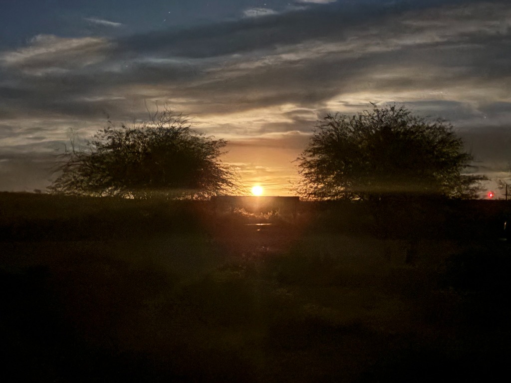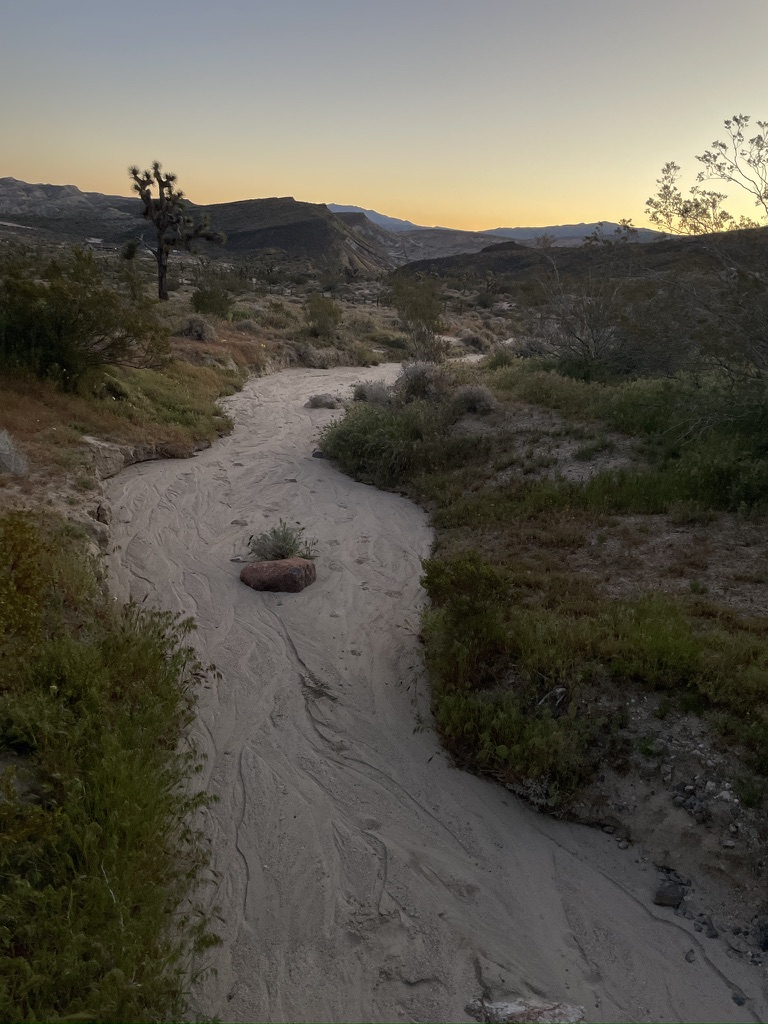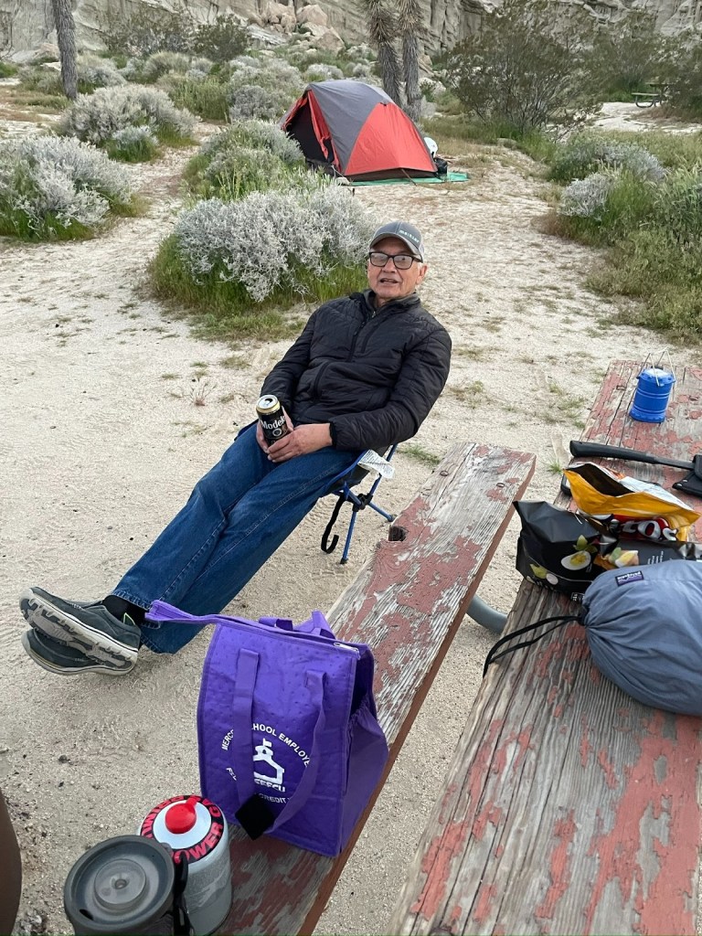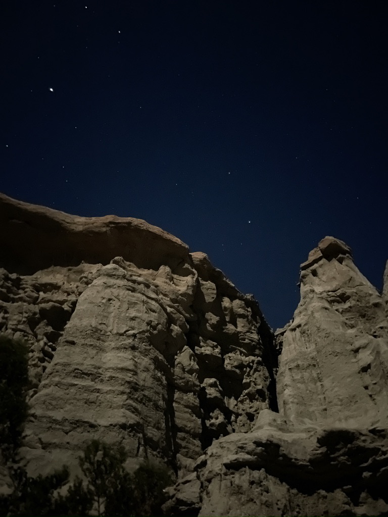 We were fortunate to have a full moon that would eclipse, making for a blood moon later in the night.  After relaxing and rehydrating, we reflected on a fellow camper’s hike to a surrounding hilltop vantage earlier.  We hiked up above our campsite where cell reception and quick check-in with the home fires was complemented by stunning views south to California city and the campground below, all illuminated by moonglow!