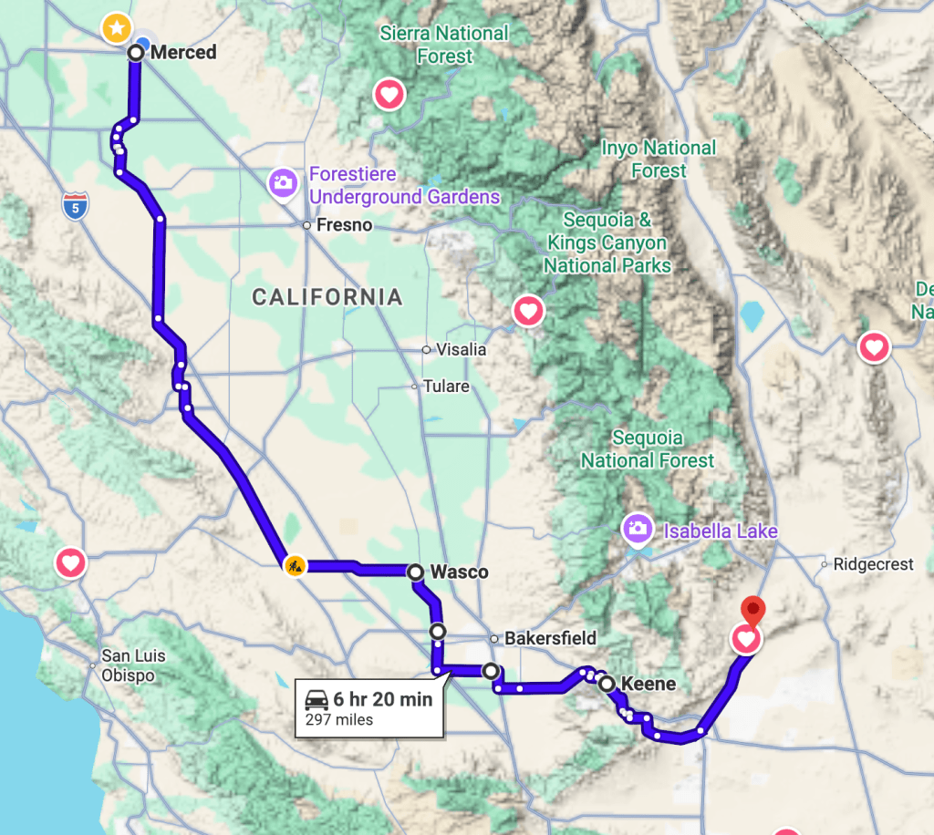 Merced to Red Rock Canyon State Park, Ricardo, CA:  296 miles  (332 miles if Ridgecrest stop for supplies is included)
