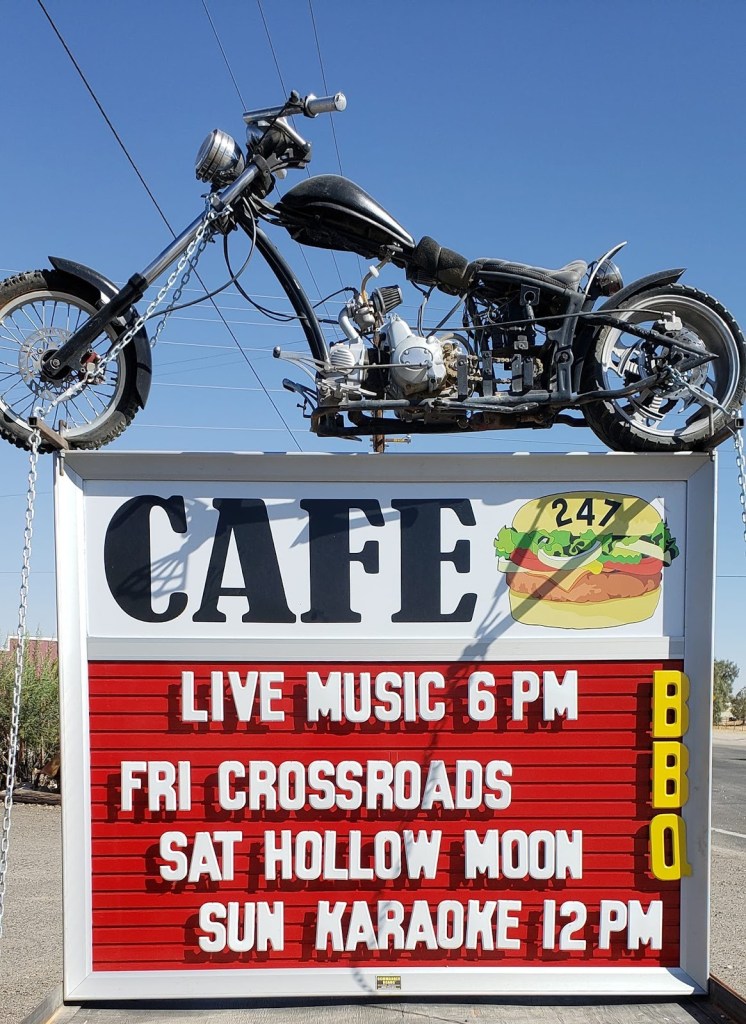 From Amigo’s, it was a zig and a zag through Barstow then south on the legendary Old Woman Springs Rd, CA-247, also known as the Barstow Rd, past the St. Joseph’s Monastery in Lucerne Valley to Cafe 247 to stop for a map check, yet another comms reset, and nalgas relief.  Since we had just eaten, it was too soon to try out the cafe’s fare.