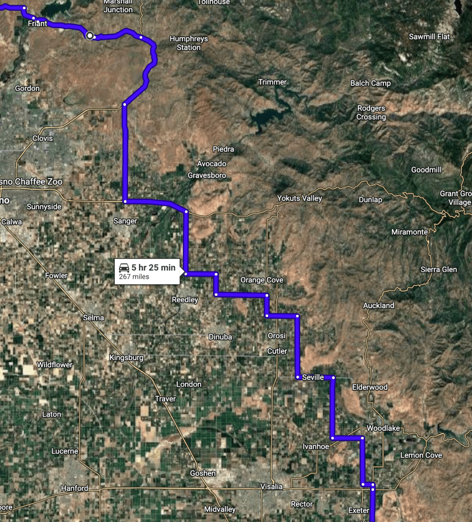 Zagging and zigging on CA-65 through almond, pistachio, citrus, and olive orchards and the myriad small agricultural communities each about seven miles apart, we zigged and zagged even more to our next stop in Friant.