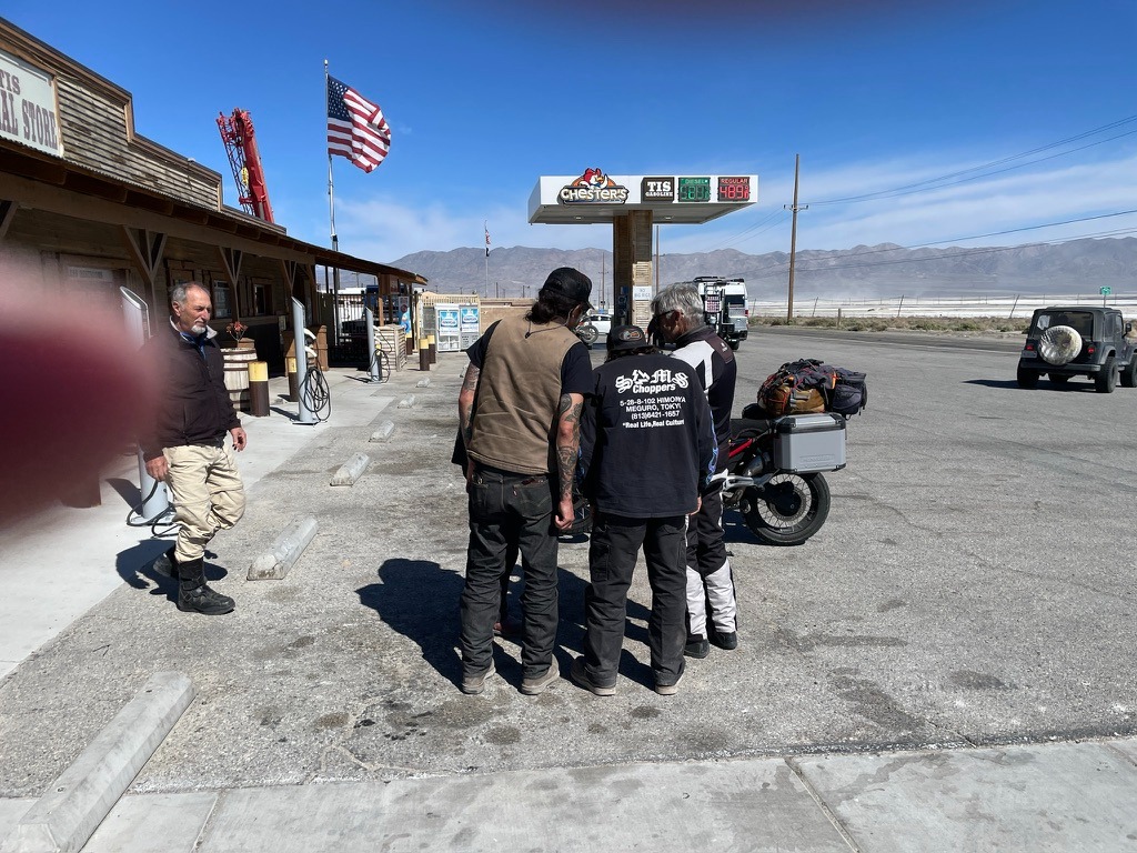Once the chopper guys reacting like Harley guys regained consciousness, they introduced themselves as chopper guys from LA who were taking their friend, a fellow chopper guy from Japan, on a tour of Death Valley.  Like us they assumed some sort of motorcycle event was taking place conscious of the number of motorcycles heading in the same direction. One of the dudes explained that their Japanese friend didn’t speak English and none of them spoke Japanese.
