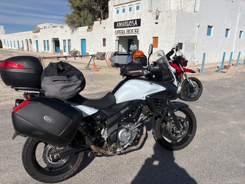 It would not be a desert ramble if we did not pay our respects at the Amargosa Opera House.  It’s only a few miles into the day, if departing, or a few miles remaining, if arriving, from or to Shoshone.  It has become something of a harbinger of a noteworthy day to come or of an evening of gratefulness that our day on the bike would soon take rest, our safe travels completed.