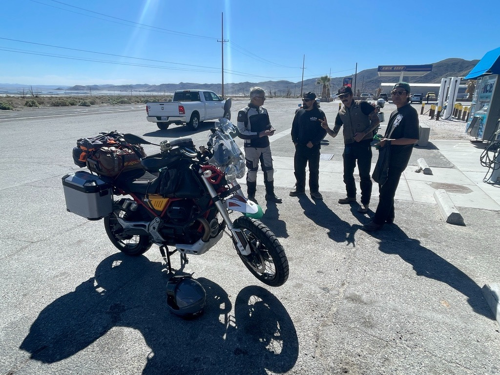 As all of this was happening, a group of four guys who were fueling up their pick-up, noticed the two Guzzis.  They were as amazed as we were to encounter two same model, different year, flashy Italian bikes in Trona.  SMAP, on his ‘decidedly not’ flashy Suzuki, sensing that all of the attention was going to the bewitching Italian beauties, whips out his phone to distract the chopper dudes with photos of his seventies era Harley Sportster and sixties Triumph Bonneville he once owned.  Like moths to a flame, they huddled around SMAP, oohing and awing.
