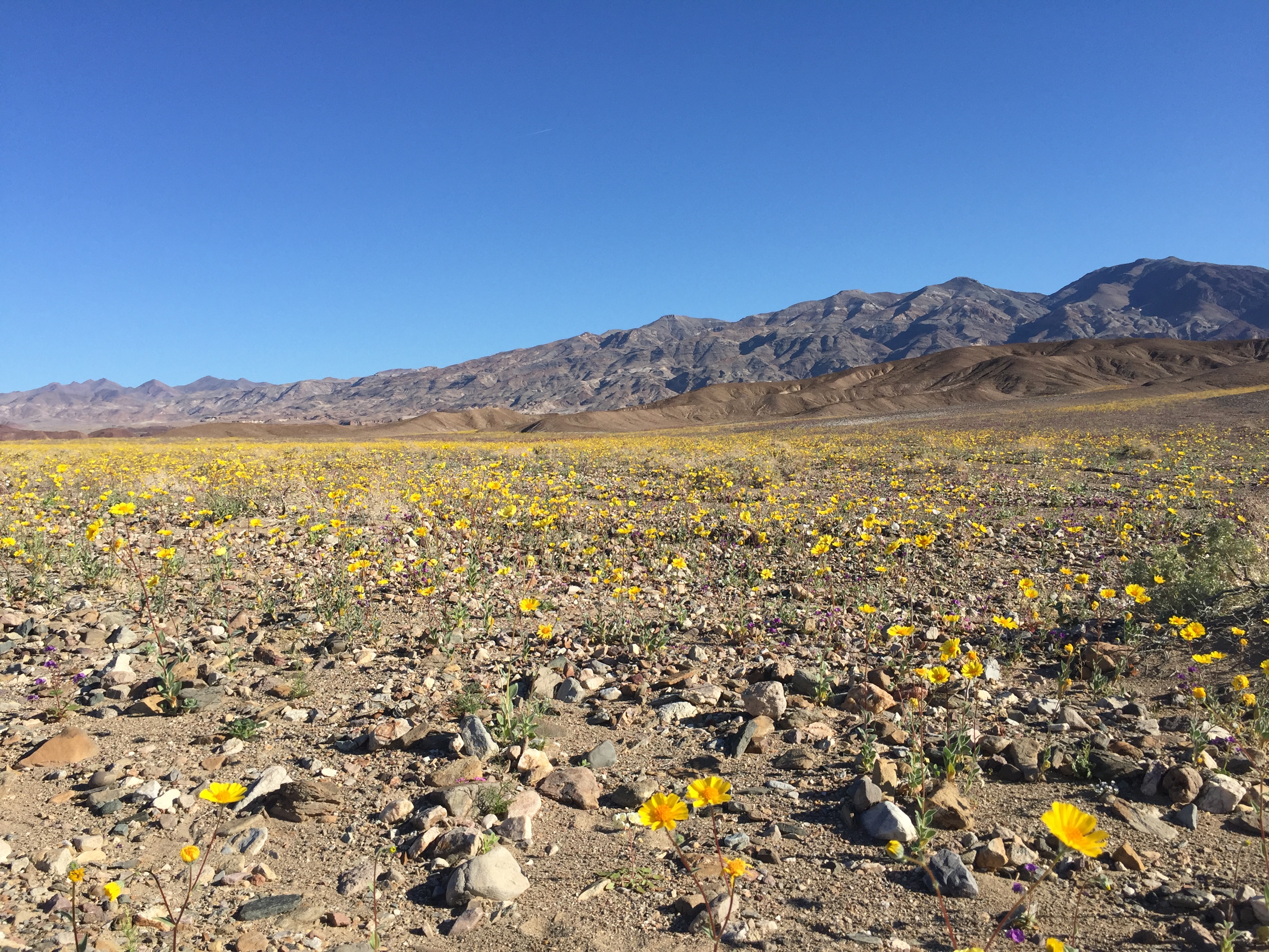 2016 Super-bloom, Death Valley featuring theDesert gold is also called desert sunflower. This annual is usually between one and two feet in height. The leaves are between one half to four inches long and occur alternately along the stem. The flowers are yellow and between one and three inches across.